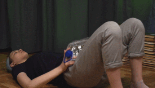 매트에 등을 대고 누운 상태에서 무릎을 구부리고 발바닥을 바닥에 평평하게 둡니다. 생수병을 골반 위에 올린 뒤, 복부와 엉덩이 근육에 힘을 주어 엉덩이를 천천히 들어 올립니다. 상단에서 몇 초간 자세를 유지한 후, 천천히 엉덩이를 바닥으로 내리며 동작을 반복합니다.
