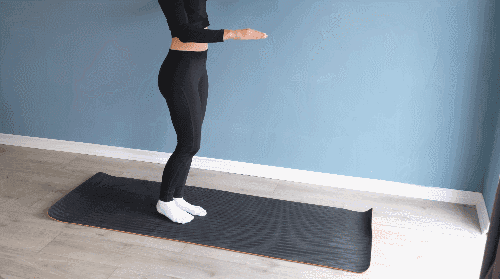 매트 위에 서서 오른손을 들어 손바닥이 바닥을 향하게 합니다. 오른쪽 무릎을 들어 올리며 무릎으로 손바닥을 가볍게 터치한 뒤, 리듬감 있게 동작을 연속 반복합니다. 같은 방식으로 왼손을 들고 왼쪽 무릎을 들어 손바닥을 터치하며 동일하게 수행합니다.