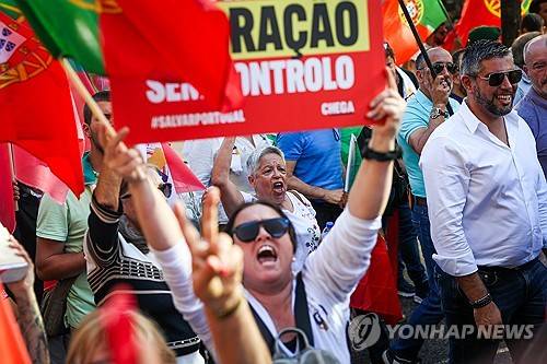 epa11632634 Far-right Chega party supporters participate in a demonstration promoted by the party 'against uncontrolled immigration and insecurity in the streets in Portugal,' in Lisbon, Portugal, 29 September 2024. Several organizations and movements, including SOS Racism, Stop Evictions, HuBB - Humans Before Borders, and Immigrant Solidarity, called via social networks for the counter-protest 'They will not pass! Against racism! Against fascism! Against Islamophobia!' at the same locations as the Chega rally. EPA/JOSE SENA GOULAO