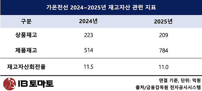 특히 재고자산의 상품(209억원)과 제품(784억원)의 합(993억원)이 1천억원에 달한다는 점도 우려되는 지점이다. 2024년 말에는 상품(223억원)과 제품(514억원)의 합이 737억원에 그쳤지만, 지난해 들어 완제품 재고가 늘어나면서 팔리지 않은 제품이 늘어나고 있는 현실이 여실히 드러난 것이다.