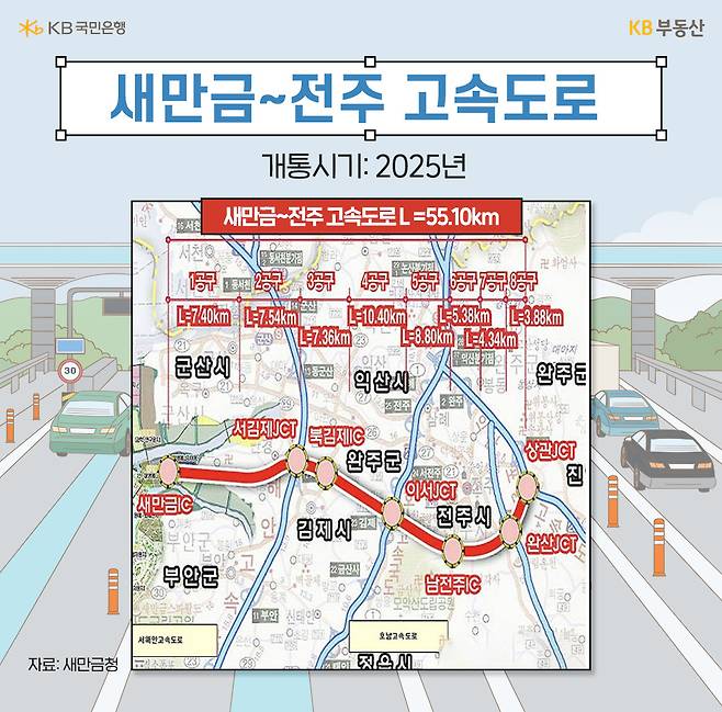 새만금~전주 고속도로도 올해 개통 예정입니다. 약 55㎞ 길이의 왕복 4차선 고속도로로, 개통 후 두 지역 간 이동시간은 기존 76분에서 33분으로 단축될 것으로 보입니다.