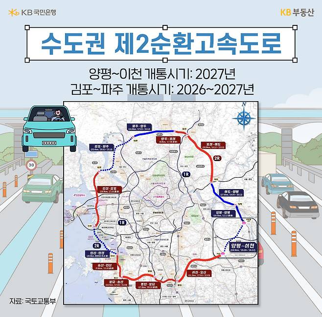 양평~이천, 김포~파주 고속도로는 수도권제2순환고속도로 양평~이천 구간(19.3㎞)과 김포~파주 구간(24.8㎞)입니다. 수도권 제2순환고속도로는 김포~파주~포천~남양주~양평~이천~오산~안산~인천~김포 264.3㎞를 연결하는 고속도로망으로, 양평~이천 구간은 김포~파주 구간이 내년과 2027년 개통되면 전체 도로의 남동부 구간과 북측을 각각 완성하게 됩니다.