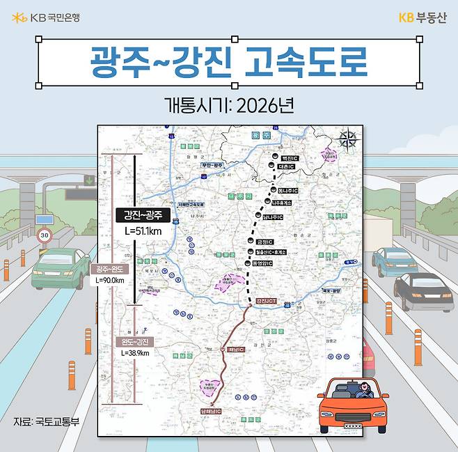 내년에 개통될 또 다른 고속도로는 광주~강진 고속도로가 있습니다. 광주광역시 서구에서 전남 강진군을 연결하는 총 길이 51.11㎞로 광주 완주 고속도로의 1단계 구간인데요. 이를 통해 두 도시의 이동시간이 40분대로 단축될 예정입니다.