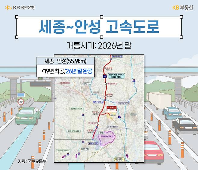 수도권에서 2030년도까지 개통 예정인 고속도로는 세종~안성 고속도로, 양평~이천 고속도로, 김포~파주 고속도로입니다. 우선 세종 포천고속도로에서 세종~안성 구간이 2026년 말 개통을 앞두고 있습니다. 세종~안성 구간은 세종분기점을 시점으로 남안성 분기점을 종점으로 하는 본선(55.9㎞)과 연기나들목에서 오송신도시를 연결하는 오송 지선(6.2㎞)으로 구성되는데요. 이 고속도로가 개통되면 서울에서 세종까지 통행시간은 평일기준 약 34분 가량 단축될 예정입니다.