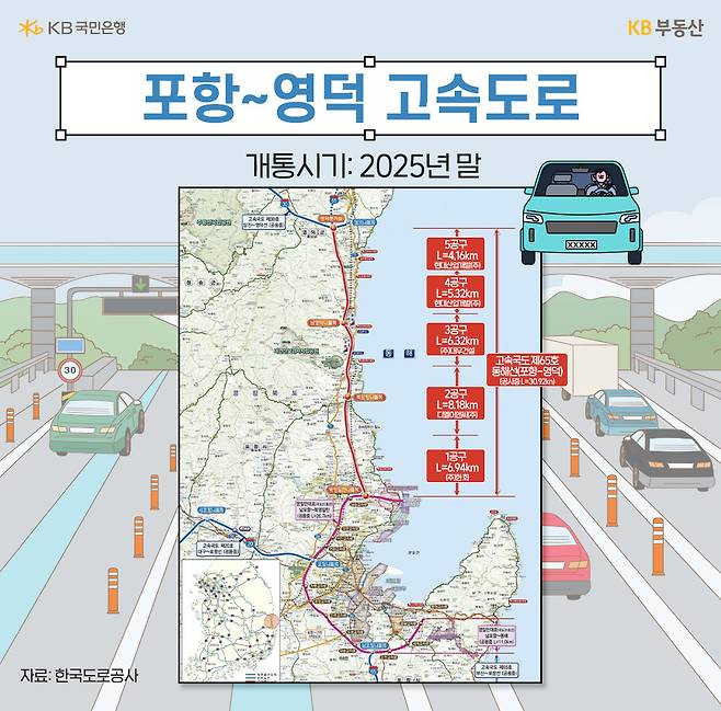 지방에서는 5년 내 6개 고속도로가 개통을 앞두고 있습니다. 우선 포항~영덕 고속도로는 총 30.92㎞ 왕복 4차선 고속도로로 올 연말에 개통될 예정입니다. 이 구간이 개통되면 7번 국도에 비해 주행거리는 6㎞, 시간은 23분 단축됩니다.