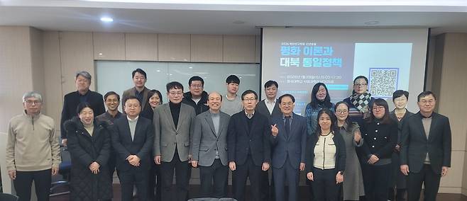 | ▲ 2026 북한연구학회 신년 포럼 기념사진/ 하트 표시를 하고 있는 필자 왼쪽으로 서보혁 회장, 임상순 평택대 교수, 구갑우 북한대학원 대학교 교수 , 진천규 통일TV 대표(뒷줄 왼쪽 끝) 및 학회 임원, 회원 등이 함께 했다. |