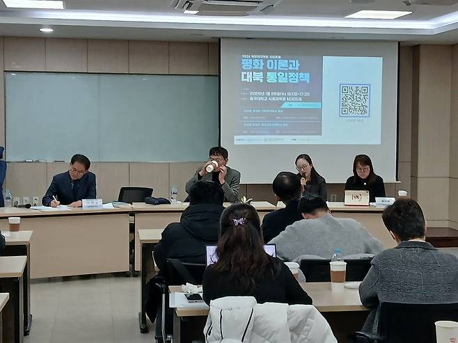 | ▲ 2026 북한연구학회 신년 포럼 토론 모습 필자의 주제 발표 이후 구갑우 북한대학원 대학교 교수(왼쪽 두번째)의 진행으로, 차승주 공주교대 교수(왼쪽 세번째)와 허지영 강원대학교 교수의 토론이 진행되고 있다. |