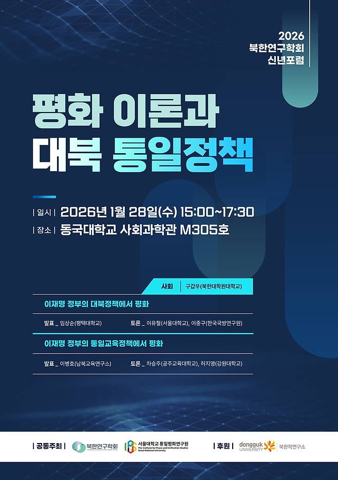 | ▲ 2026 북한연구학회 신년 포럼 포스터 북한연구학회 30대 회장으로 취임한 서보혁 통일연구원 선임연구위원은 2026년 신년사에서 북한학과 평화학의 융합에 힘쓰겠다고 밝혔다. |