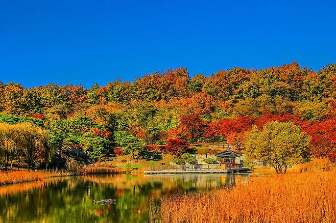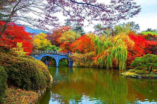 가을철이 되면 온 전체가 단풍으로 물들여지며, 특히 돌다리를 건너며 바라보는 울긋불긋한 수목과 연못은 시간여행을 떠난 듯 신비로운 분위기를 선사합니다.