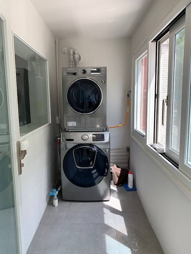 베란다에는 아무래도 거실과 경계선이다 보니 추위를 완전히 막기 위해 단열에 좋은 터닝 도어를 달았어요. 바닥에는 깔끔하게 타일을 깔고 전에 쓰던 세탁기와 건조기를 가져와 직렬 설치해놓았어요.