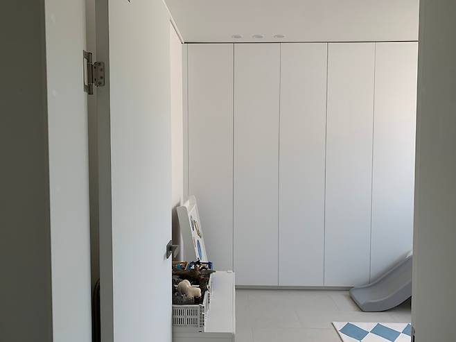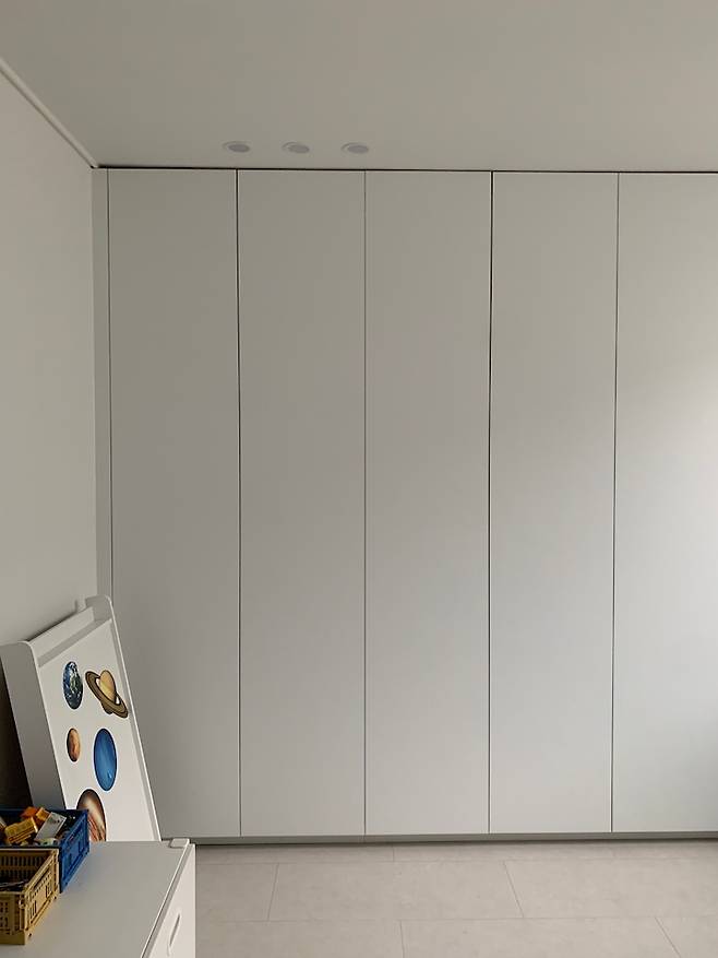 한 쪽은 아이의 옷장을 만들었고 맨 오른쪽 끝에는 스타일러를 배치했어요. 아직은 아이의 옷이 많이 없어서 저희 옷이랑 이불 넣는 곳으로 빌려 쓰고 있어요 :)
