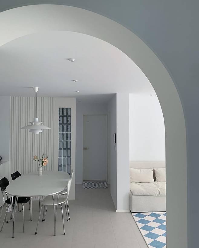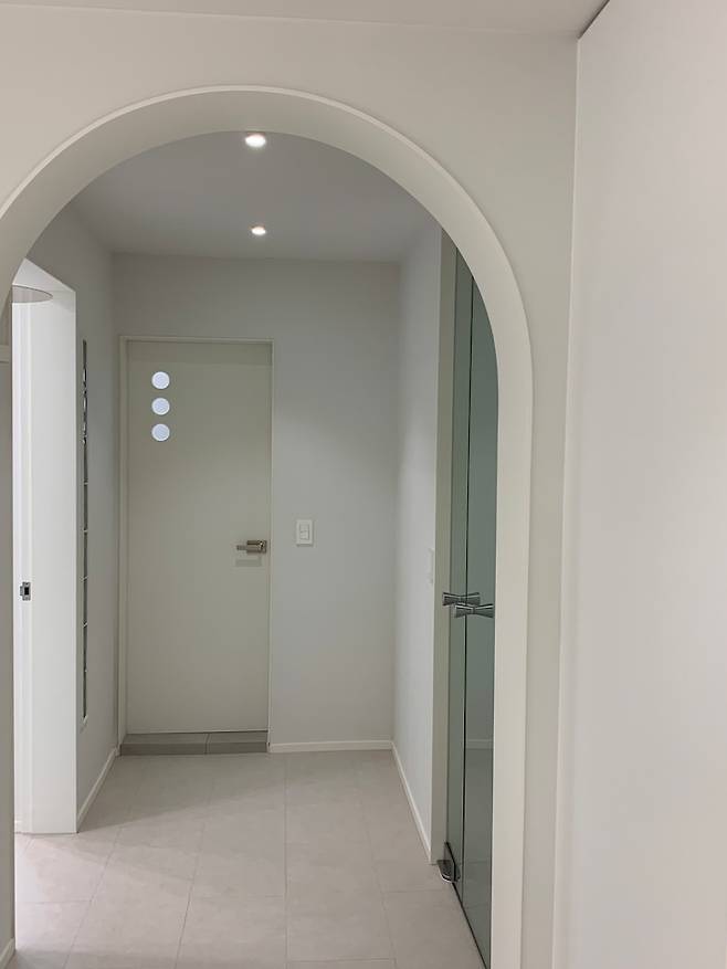 거실과 현관을 이어주는 통로는 아치형 문으로 만들어 봤어요. 또 현관쪽 화장실 문은 불이 켜져 있으면 사용중임을 알 수 있게 동그라미로 포인트를 주었어요.