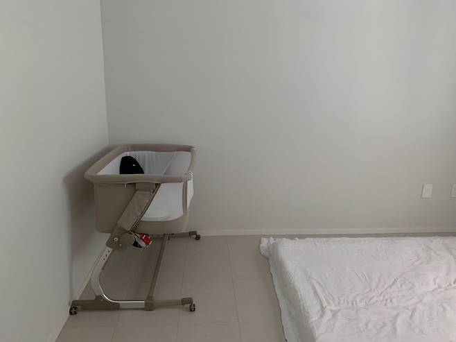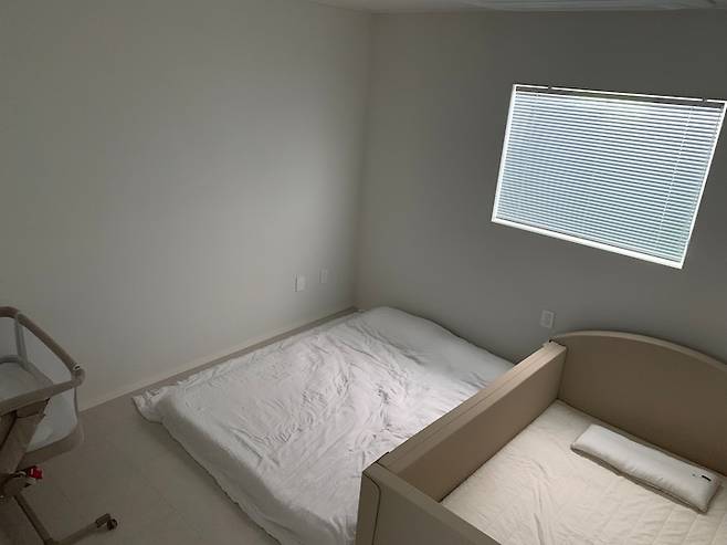 기존에 저희 부부가 사용하던 침대는 게스트룸에 두었고 아이 침대 옆에 토퍼 매트리스를 깔아두었습니다. 첫째 아이는 범퍼침대에서 자고 둘째는 아기침대에서 자도록 배치해 두었답니다 :)