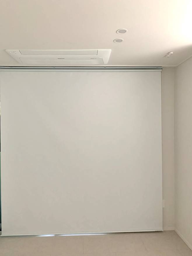 명색이 게스트룸인 만큼 손님이 쉬면서 영화라도 보라고 스크린을 설치해놨어요. 볕이 잘 드는 방이라 혹시라도 숙면에 방해가 될까 봐 암막이 잘 되는 스크린으로 설치를 해두었답니다 :) 스크린 뒤로는 작은 베란다가 있는데 김치냉장고와 아이 용품 등으로 채워놓았어요.