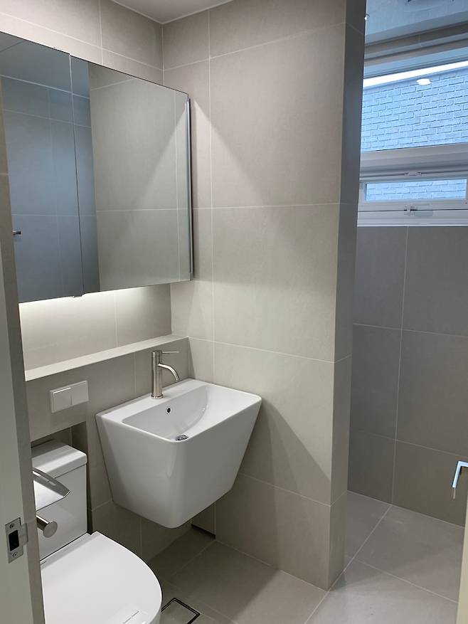 프라이빗한 샤워 공간을 만들고 싶어 졸리 컷으로 완성된 조적 파티션이에요. 혹시라도 좁아보이진 않을 까 걱정도 하였지만 변기, 수전과 분리되어 있어 청결하고 샤워할때 물이 튀기는 유리보다 청소를 덜 할 수 있어서 결과적으로 굉장히 만족하고 있습니다 :)