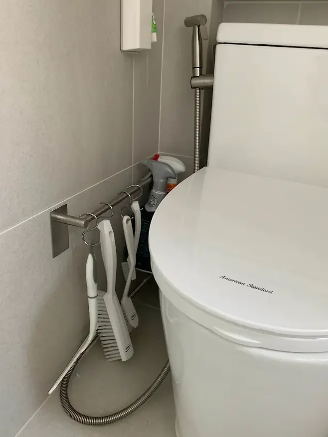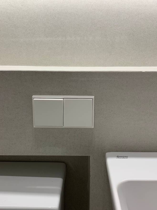 거실 욕실에 들어갈 수전과 변기들도 저희가 직접 제품을 선택하였는데 역시 아메리칸 스탠다드는 실망시키는 법이 없더라구요. 깔끔하고 퀄리티도 좋은데 디자인도 예뻐서 만족하고있어요. 그리고 거실 욕실에도 융 스위치를 설치해두어서 수건 장 밑 간접조명을 키는데 편하게 잘 사용하고있어요.