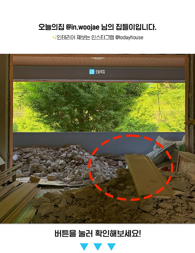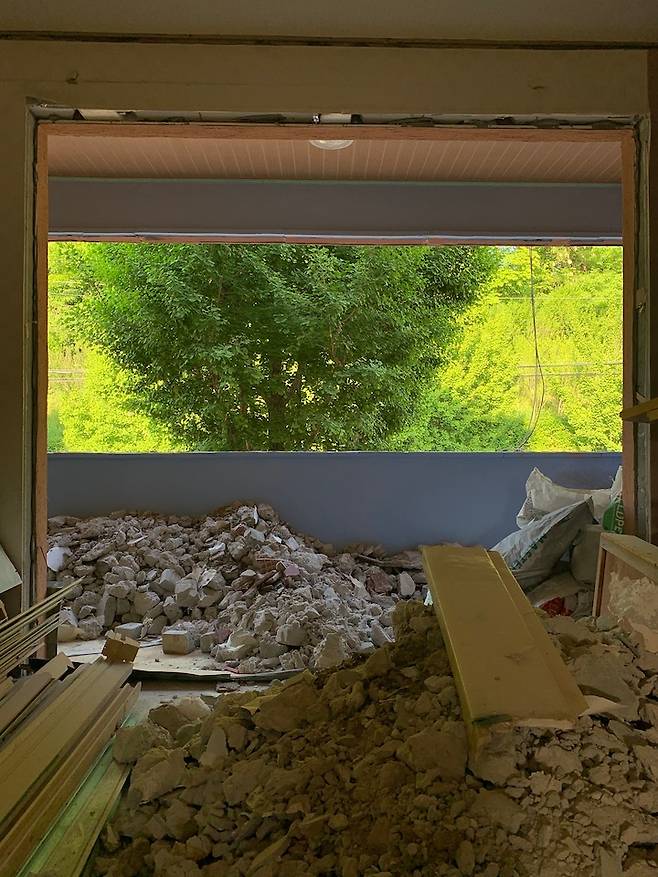 철거 공사 중에 찍은 저희 집 거실 창밖이에요. 리모델링을 처음 구상할 때부터 거실에는 이 나무를 볼 수 있게 만들어야겠다 라고 생각하고 최대한 담아낼 수 있도록 노력했어요.