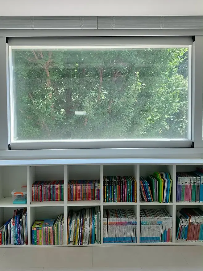 그리고 독서를 너무 좋아하는 아이를 위해 거실 창문 밑에 책장을 두었는데 굉장히 만족하고 있어요!