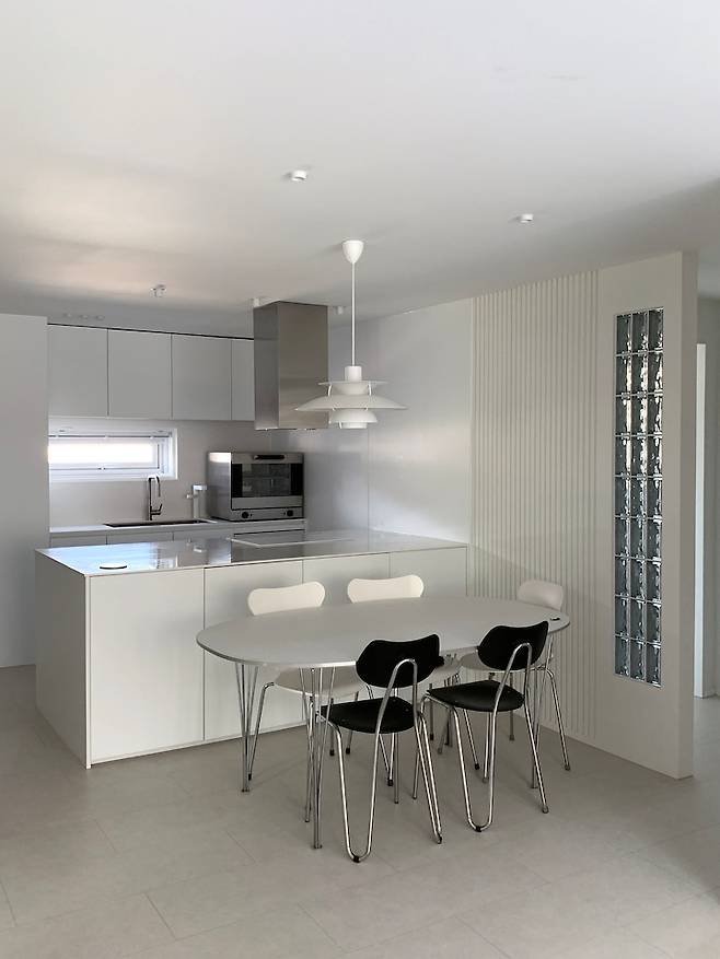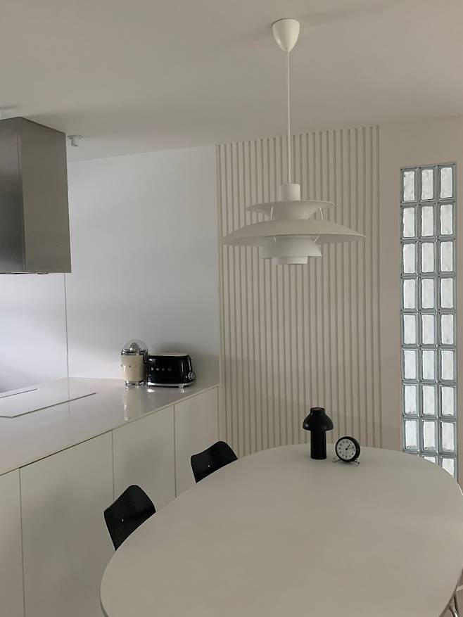 식탁과 조명은 집의 얼굴이라 어떤 제품이 가장 우리집과 어울릴지 고민을 많이 하였는데 너무 만족하고 있습니다. 기존 벽에 화이트 템바 보드를 넣고 옆에 가벽을 조금 더 만들어 유리블록을 포인트로 넣었는데 저희 집 주방의 포토 스팟이 된 것 같아 너무 만족해요