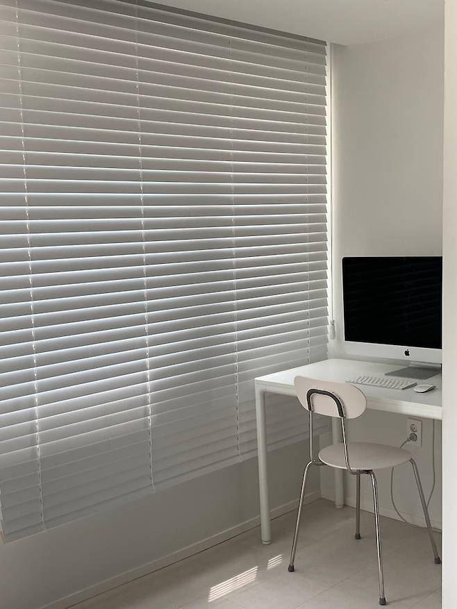 아, 그리고 저희 거실은 내력벽이 있어 뒤쪽으로 나있는 공간을 어떻게 활용할지 고민끝에 컴퓨터를 놓기로 했어요! 이렇게 테이블을 놓고 컴퓨터를 올려놓으니 작은 컴퓨터방이 만들어졌어요. 애매하였던 자투리 공간을 잘 활용한 것 같아 뿌듯해요. 내력벽이 자연스럽게 모니터를 가려주어 프라이버시를 지켜준 답니다 :)