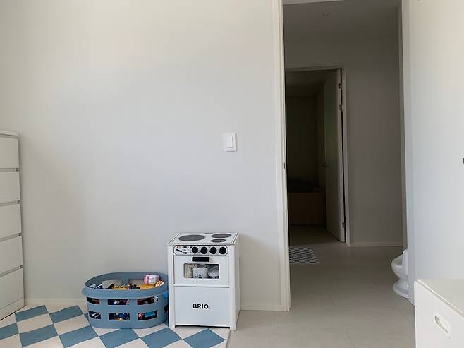 아이의 방은 저희 침실 바로 맞은편에 있어서 아이가 아침에 눈을 뜨고 일어나면 바로 정면에 있는 아이 놀이방으로 와서 놀면서 상상력을 펼치는 장소이기도 합니다 :)