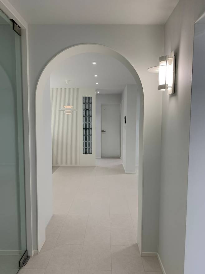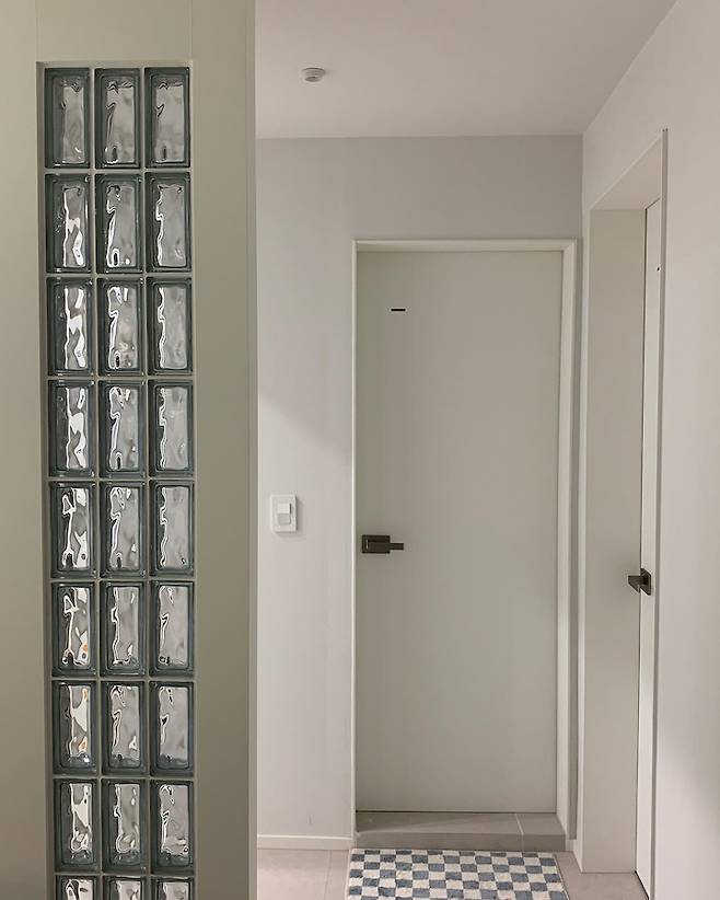 현관에서 주방 쪽을 바라보는 시선에 포인트를 주고 싶었는데 마침 화장실 왼쪽 아이방 구조가 너무 개방되어 있는 느낌이라 살짝 가려줄 겸 투명 유리블럭을 만들기로했어요. 심플하게 세줄로 포인트!