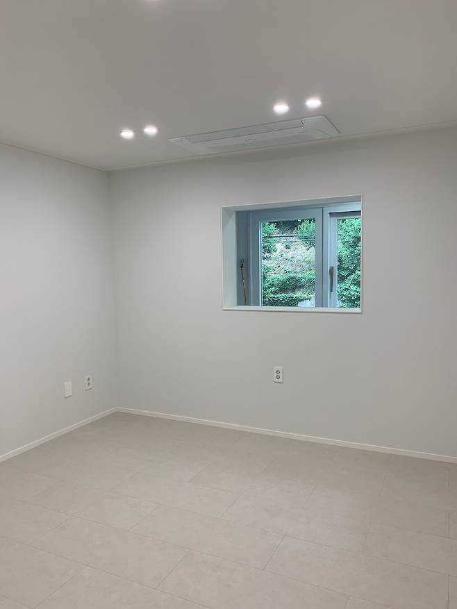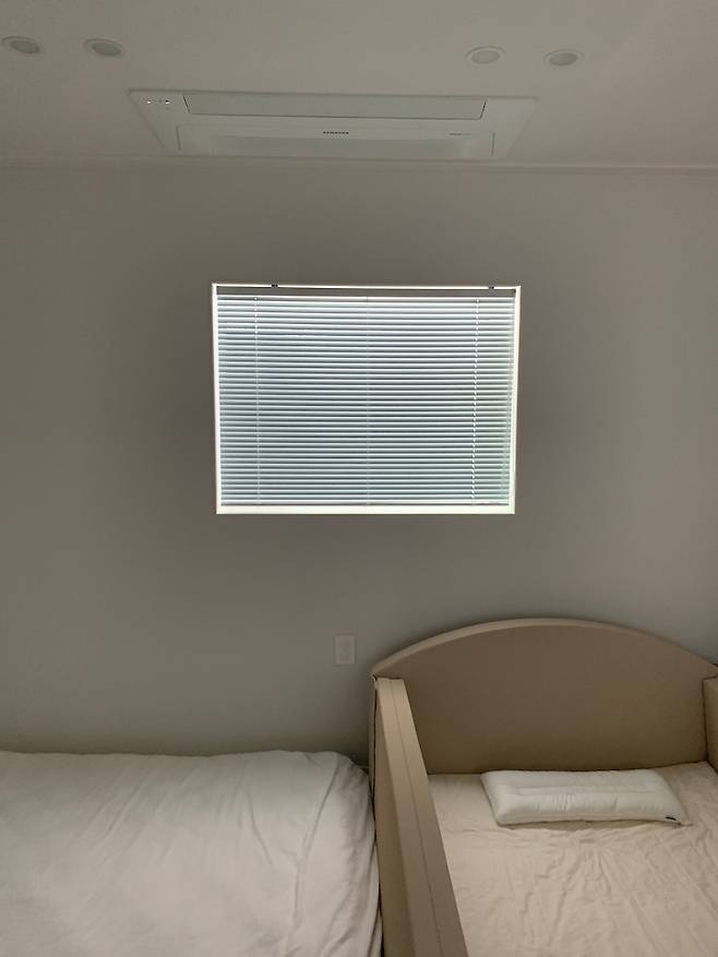 공사 전 안방의 특징은 창문이 투머치 하게 크다는 느낌이 있었어요. 그래서 창 사이즈를 줄였고 문을 다는 대신 빛이 들어오도록 투명 유리로 달았어요. 나중에는 방 조도를 조절하기 위해 블라인드를 설치했어요