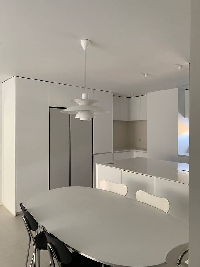 제가 원하던 대면형 주방이 완성되었어요! 미드센츄리 느낌으로 분위기를 내고 싶어 식탁부터 의자까지 원하는 제품으로 배치 해놓았어요. 여러 제품 고민 끝에 가장 클래식하면서도 저희 집과 어울리는 프리츠 한센 식탁과 루이스 폴센 PH5 조명을 선택했습니다 :)