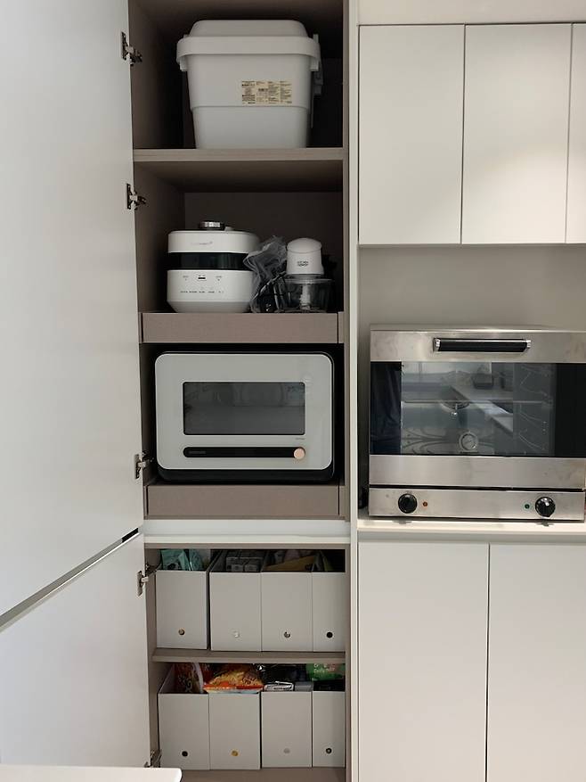 아이를 키우다 보면 설거지나 요리를 할 때 아이를 볼 수 없어 괜히 불안했는데 이제는 거실에 책이나 장난감을 둬서 아이가 제 시야 안에 들어오게 해요. 요리하면서 아이와 이야기를 나누면 아이도 혼자가 아니라는 생각에 잘 놀더라구요. 대면형 주방의 장점들을 누리는 중이랍니다 :)