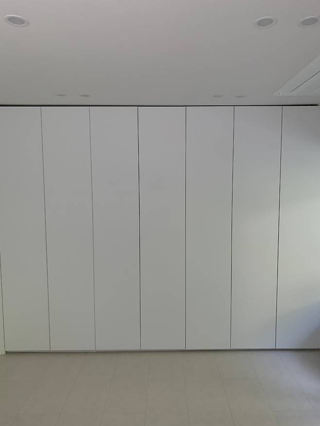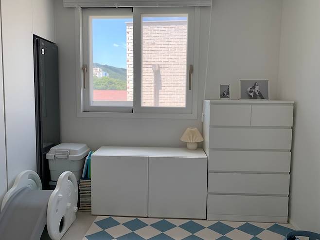 명색이 게스트룸인 만큼 손님이 쉬면서 영화라도 보라고 스크린을 설치해놨어요. 볕이 잘 드는 방이라 혹시라도 숙면에 방해가 될까 봐 암막이 잘 되는 스크린으로 설치를 해두었답니다 :) 스크린 뒤로는 작은 베란다가 있는데 김치냉장고와 아이 용품 등으로 채워놓았어요.