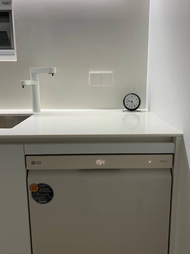 식세기 이모님과 정수기를 세트로 설치했는데 굉장히 만족하고 있어요. 아기가 둘이 되면서 식기세척기 이모를 모셔왔는데 정말 열일 하세요. 육퇴를 일찍 당겨주시는 이모님 최고! 디자인도 깔끔하고 예쁜 데다가 기능까지 너무 좋더라구요. 그리고 주방에도 융스위치와 콘센트를 달았는데 너무 실용적이면서도 예뻐요 :)