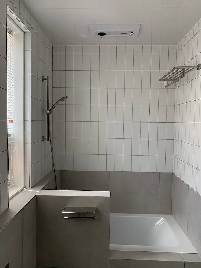 그리고 천장엔 아이들이 목욕할 때 정말 유용하게 잘 사용하고 있는 힘펠 휴젠뜨 환풍기를 설치했어요! 겨울에 목욕시킬 때 너무 추워 감기 걸릴까 걱정했는데 히터 틀어놓으면 따뜻해서 그럴 걱정도 없고 목욕을 마치고 드라이 성능으로 아이 머리를 말릴 수 있어서 강력 추천이에요 :)