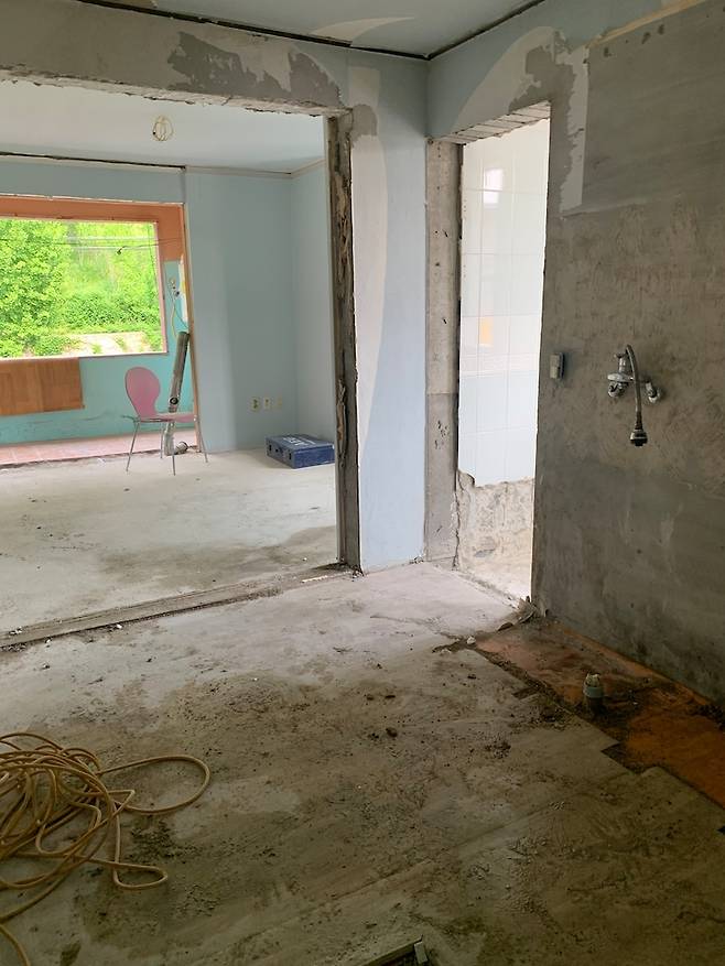 철거 공사 중에 찍은 저희 집 거실 창밖이에요. 리모델링을 처음 구상할 때부터 거실에는 이 나무를 볼 수 있게 만들어야겠다 라고 생각하고 최대한 담아낼 수 있도록 노력했어요.
