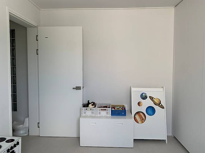 아이의 방은 저희 침실 바로 맞은편에 있어서 아이가 아침에 눈을 뜨고 일어나면 바로 정면에 있는 아이 놀이방으로 와서 놀면서 상상력을 펼치는 장소이기도 합니다 :)