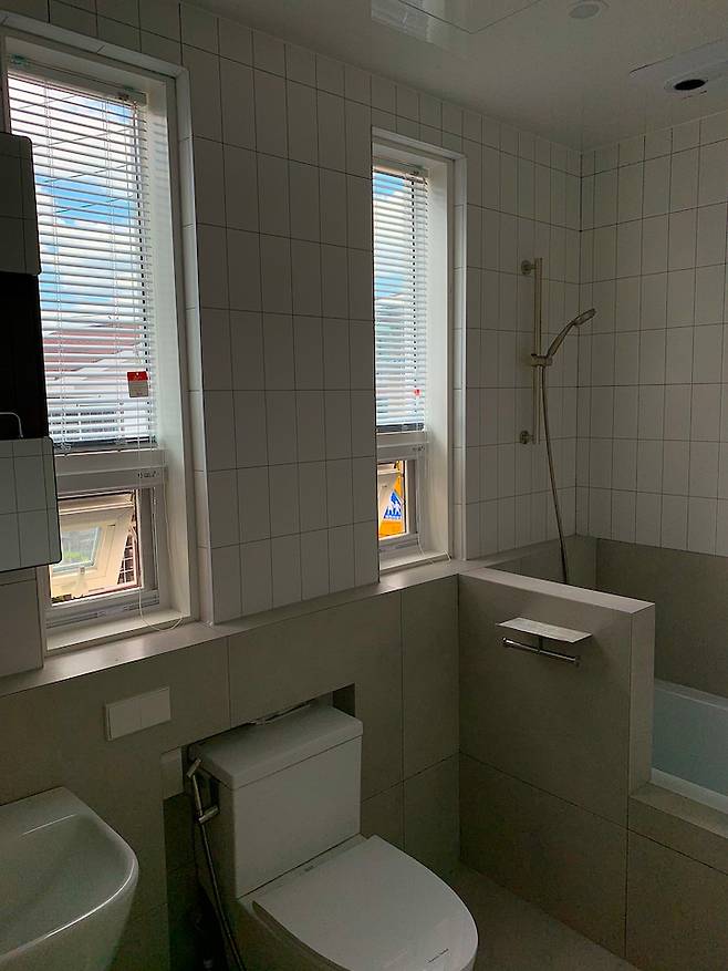 레퍼런스가 없어 불안했지만 감으로 밀고 나가 완성된 욕실이에요! 욕실이다보니 방수 잘 되는 블라인드를 설치해서 평소에는 햇빛이 들어올 수 있도록 열어두고 지내요. 자연광이 예쁘게 들어오는 곳이라 마음에 들어요 :)