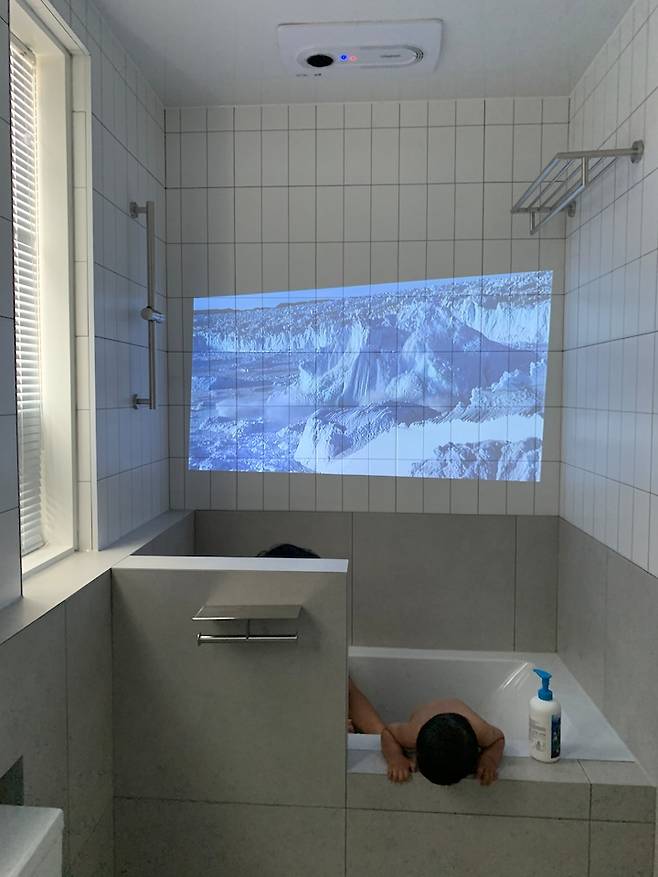남편은 아이 씻길 때 벽에다 빔을 쏜 채로 씻겨요. 동물들이나 자연경관이 나오는 네셔널그래픽, 다큐 등을 틀어놓은채 아이랑 이야기하고 물놀이하고 1시간을 훌쩍 넘겨서 나와요. 저에겐 마음 편히 저녁 준비할 시간이 생겨서 좋답니다ㅎㅎ