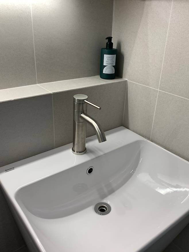거실 욕실에 들어갈 수전과 변기들도 저희가 직접 제품을 선택하였는데 역시 아메리칸 스탠다드는 실망시키는 법이 없더라구요. 깔끔하고 퀄리티도 좋은데 디자인도 예뻐서 만족하고있어요. 그리고 거실 욕실에도 융 스위치를 설치해두어서 수건 장 밑 간접조명을 키는데 편하게 잘 사용하고있어요.