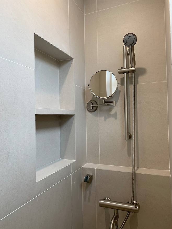 프라이빗한 샤워 공간을 만들고 싶어 졸리 컷으로 완성된 조적 파티션이에요. 혹시라도 좁아보이진 않을 까 걱정도 하였지만 변기, 수전과 분리되어 있어 청결하고 샤워할때 물이 튀기는 유리보다 청소를 덜 할 수 있어서 결과적으로 굉장히 만족하고 있습니다 :)