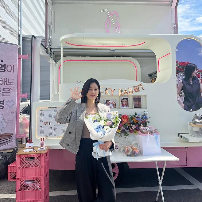 꽃다발을 든 이보영이 세련된 오피스 룩을 선보이고 있다. 체크 패턴의 그레이 재킷과 블랙 와이드 팬츠의 조합은 프로페셔널한 느낌과 함께 트렌디한 감각을 더하고 있다. 특히 화사한 꽃다발과 대비되는 모노톤 의상은 그녀의 우아한 분위기를 한층 더 돋보이게 한다. 'LUCKY RABBIT'이라는 간판이 보이는 카페 푸드트럭 앞에서 밝은 미소와 함께 손을 흔드는 모습은 친근하면서도 스타일리시한 그녀의 매력을 잘 표현하고 있다.