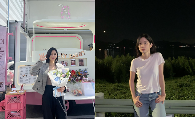밤하늘을 배경으로 한 이보영의 심플한 캐주얼 룩이 시선을 사로잡는다. 기본에 충실한 화이트 티셔츠와 데님 팬츠의 조합으로 꾸밈없는 자연스러움을 강조하고 있다. 어두운 밤 속에서도 돋보이는 그녀의 맑은 피부와 내추럴한 헤어스타일은 편안하면서도 세련된 분위기를 자아내고 있다. 산과 물이 어우러진 야경을 배경으로 한 이 룩은 일상 속 여유로움과 자연스러운 아름다움을 동시에 보여주는 스타일링의 좋은 예시다.