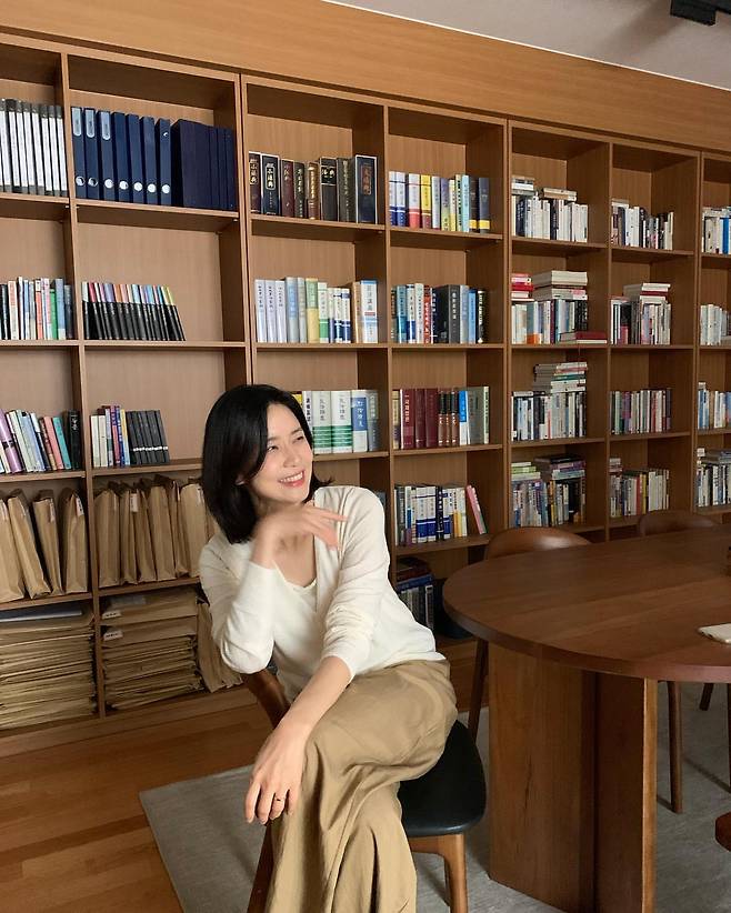 배우 이보영이 도서관에서 세련된 캐주얼 룩을 선보이고 있다. 화이트 톤의 니트 가디건과 베이지색 와이드 팬츠를 매치한 그녀의 스타일은 편안하면서도 우아한 분위기를 연출하고 있다. 특히 자연스럽게 흐르는 단발 헤어스타일과 미니멀한 메이크업은 지적인 이미지를 한층 더 강조하고 있다. 배경의 책장과 어우러진 베이지 톤의 의상은 따뜻하고 차분한 분위기를 완성하며, 일상 속에서도 스타일리시함을 잃지 않는 배우의 패션 센스를 엿볼 수 있다.