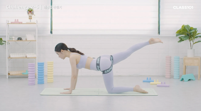 이번에는 다리를 접은 상태에서 뒤로 들어줍니다. 다리를 접어서 내 등과 허벅지가 수평이 될 수 있도록 맞춰주며 엉덩이의 자극을 느낍니다. 이 역시 양쪽 다리 모두 10회씩 반복합니다.
