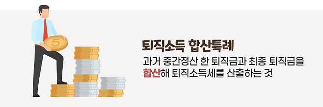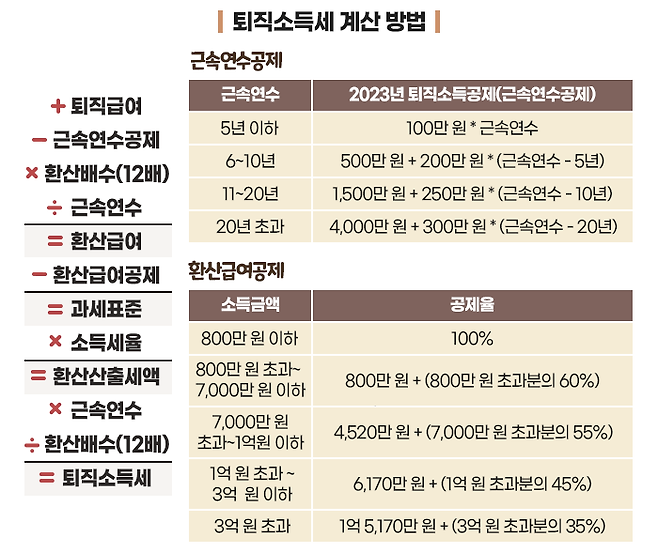 퇴직급여는 장기간에 걸쳐 형성된 소득이고, 퇴직자의 노후 생활비 재원으로 활용됩니다. 그래서 장기 근속자의 퇴직소득세 부담을 덜어주기 위해 다양한 장치를 두고 있습니다.
