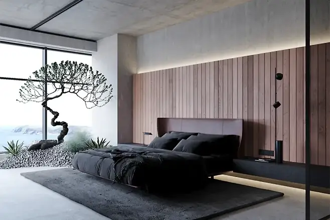 무채색 계열의 침구, 텍스처가 살아 있는 암석 조형물은 마치 리조트처럼 세팅되어 있다. 철제 프레임의 조명이 천장에서 떨어지고, 구석에는 검은 강철 소재의 행잉 랙이 자리 잡고 있다. 이 모든 요소는 과하게 꾸미지 않으면서도 고급스러운 긴장감을 만들어낸다.