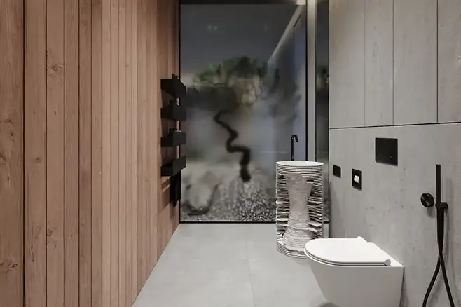 거울은 프레임 없이 벽에 매립되어 있고, 샤워 공간은 투명 유리로 가볍게 구분된다. 드레인조차도 디자인 요소처럼 자연스럽게 숨어 있다.