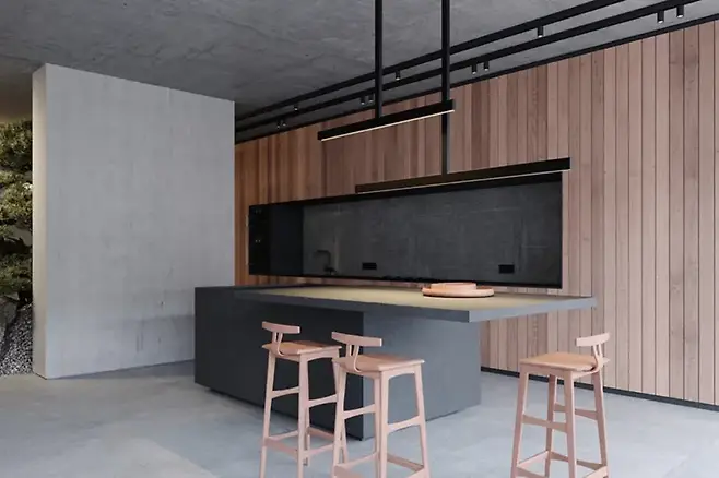 주방은 공간의 흐름 사이 자연스럽게 등장한다. 벽과 싱크대 모두 동일한 시멘트 마감재로 덮여 있어 공간 전체가 하나처럼 연결되며, 수납장은 손잡이 없는 매립식으로 설계되어 시선의 방해를 최소화했다.
