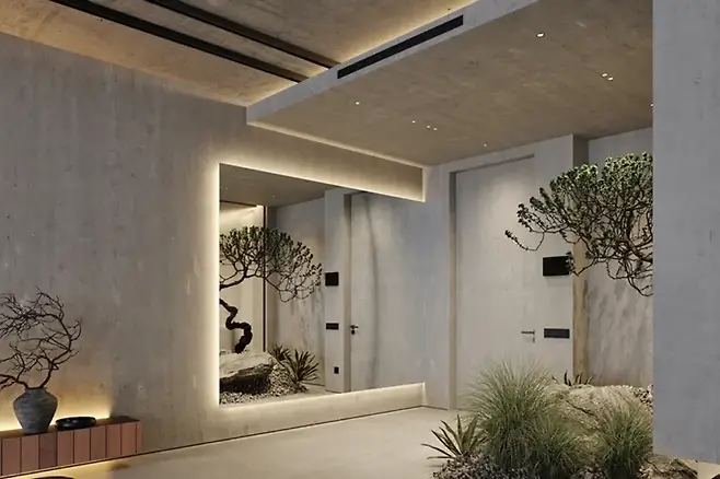 미니멀과 과감함이 동시에 녹아든 입구는 마치 갤러리처럼 여백이 풍부하고, 긴장감 있게 설계되어 있다.