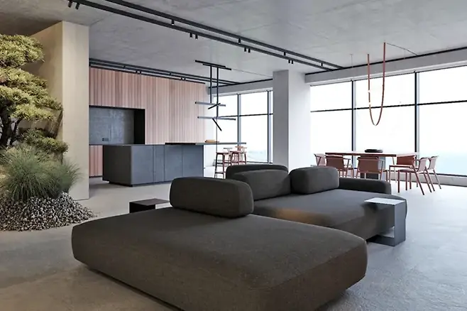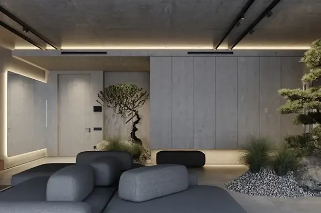 회색 계열의 거실은 한 폭의 사막 풍경을 닮았다. 벽면은 물결처럼 부드럽게 시멘트가 마감되어 있고, 바닥과 천장은 군더더기 없이 정제되어 있어 오히려 주변 가구들의 질감을 더 돋보이게 만든다.