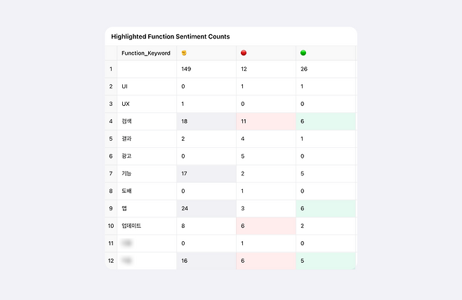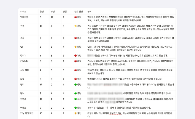 GPT가 만들어준 표를 보니, '검색'에 대한 중립, 부정, 긍정 키워드가 모두 여러 번 언급된 것을 확인할 수 있었어요. 또 '업데이트'라는 키워드는 긍정적인 키워드보다는 부정적인 키워드와 함께 많이 쓰였다는 것도 알게 되었어요. 이를 통해 사람들은 검색 기능에 대해 많은 관심을 가지며, 업데이트에 대해서는 주로 부정적인 감정을 느꼈구나!라고 이해할 수 있었어요.