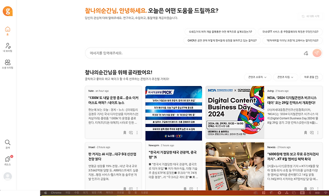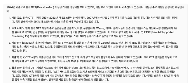 구버는 익숙한 듯, 익숙하지 않은 인터페이스를 갖고 있어요. 질문을 입력하는 방식은 퍼플렉시티 등과 유사하지만 사용자 개인을 위한 큐레이션 콘텐츠가 함께 적용된 점은 유사 서비스에서 만나보지 못한 구성이기 때문이에요. 저는 콘텐츠 산업에 대해 알고 싶었고, 그중에서도 OTT 산업 현황에 대한 내용을 확인해 봤어요.